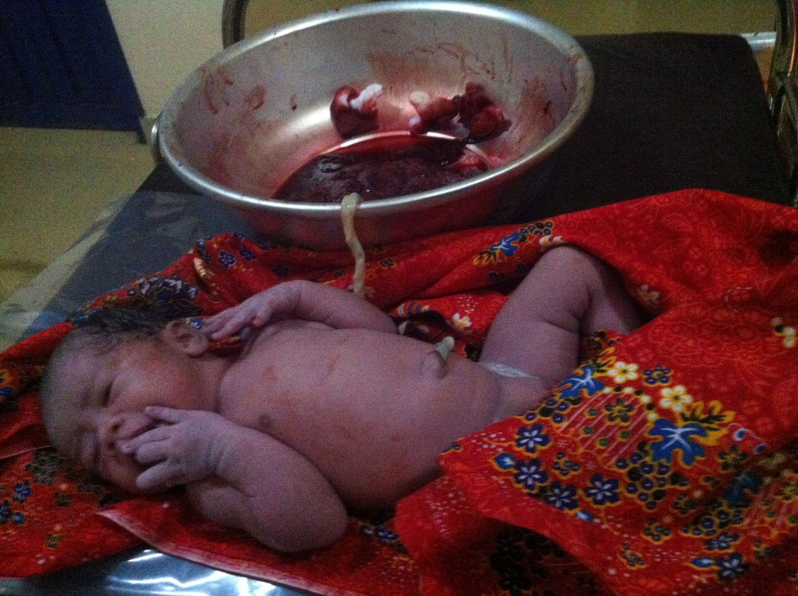I’ve managed to keep the placenta attached to the baby as long as I could. The mommy was feeling good so no one pushed me to clamp the cord. The woman gave birth to the placenta and the baby was still connected. I let the midwife stitch the woman and I took the baby on the bed to check her up. Nobody was bothering us; I was enjoying this lotus baby and letting her enjoying her precious placenta soul sister. I cutted the cord one hour later when mommy was ready to breastfeed her newborn baby girl.