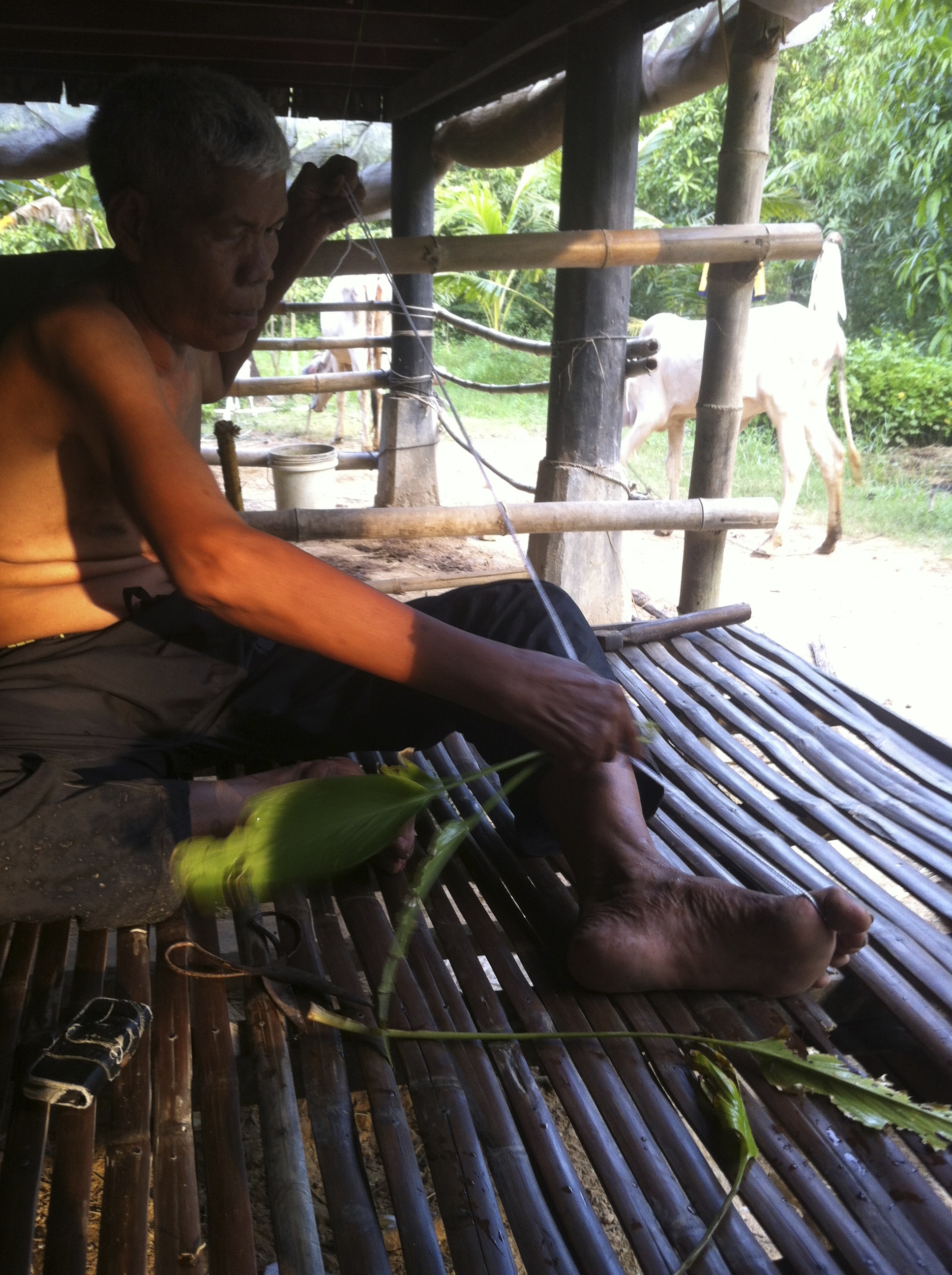 Then he takes the white string and starts rub the stems above it several times .. while he’s doing this friction he blows on the leaves and the twine, when he has finished he puts back everything in the small plate.
